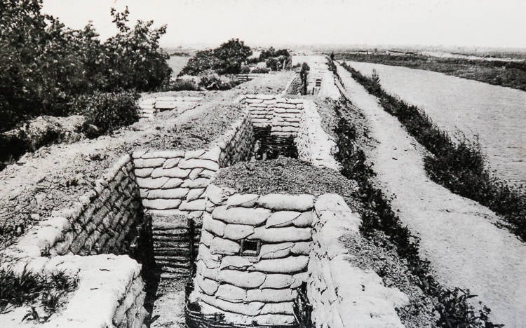 Het moerassige gebied dat bij tussen geallieerden en vijand ontstaat wordt nog versterkt met valkuilen en prikkeldraad.