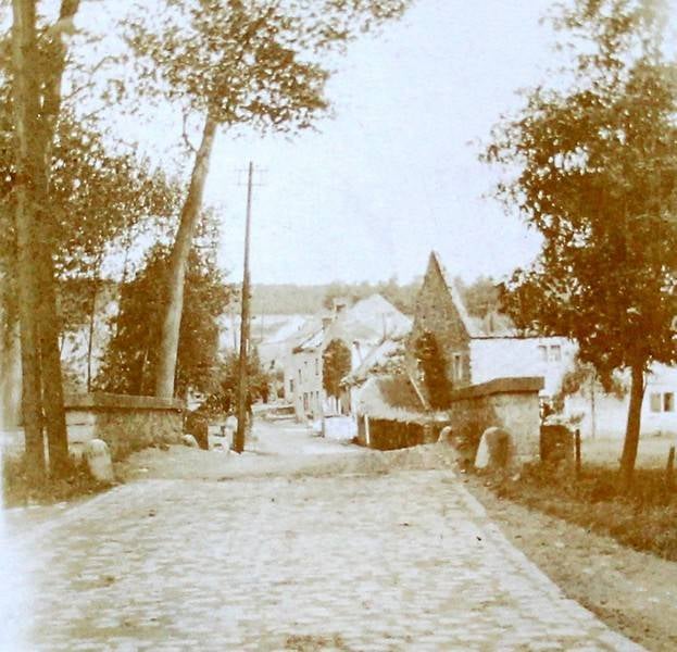 Het beschieting door de Belgen vanuit de huizen veroorzaakt zware verliezen voor de Duitsers die in rij lopen, het wapen op de heup wat volgens de instructie werd uitgevoerd.
