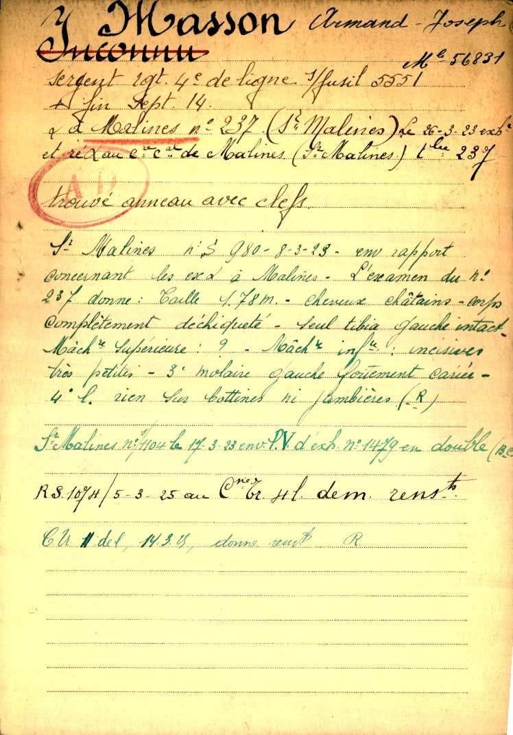 In Mechelen kreeg onderwijzer Hendrik Haesen de leiding van de dienst. Tot maart 1916 werden 508 slachtoffers van de eerste oorlogsmaanden opgegraven. Vooral Belgische soldaten en ook Duitse, maar ook een 40-tigtal burgers.