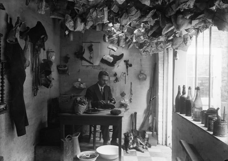 Hendrik Haesen in zijn kantoor, aan het plafond en tegen de muur bundeltjes met voorwerpen die bij de opgegravenen werden gevonden, en wellicht soms nog konden helpen bij identificatie (foto Stadsarchief Mechelen)