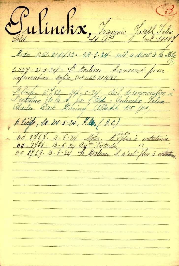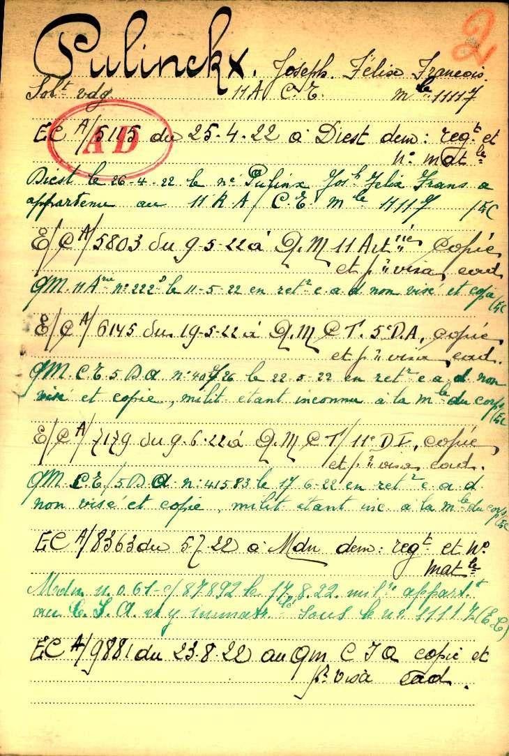 Brief van stad Diest op 26-04-1922 de genoemde Pulinckx Joseph Felix Frans behoorde tot het 11e RA / C.E. stamnummer 11117