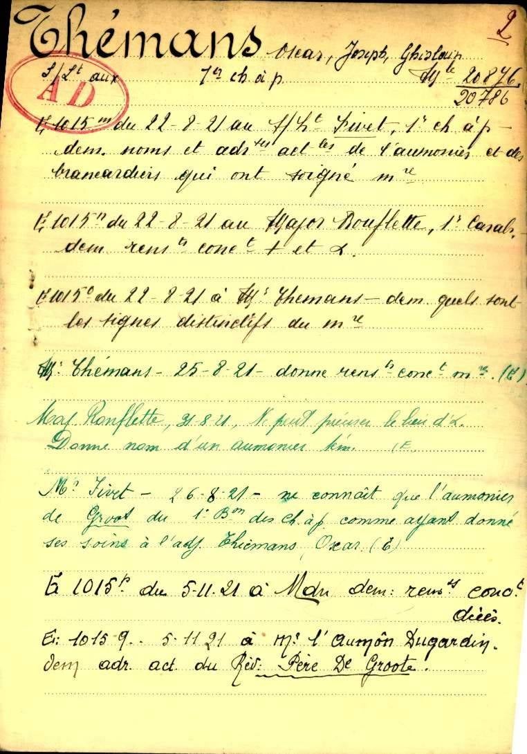 In een brief van mhr. Fivet van 26 augustus 1921 zegt hij dat aalmoezenier De Groot, van het 1ste Battallion van de Jagers te Voet, zijn bekommerd had om onderluitenant Themans.