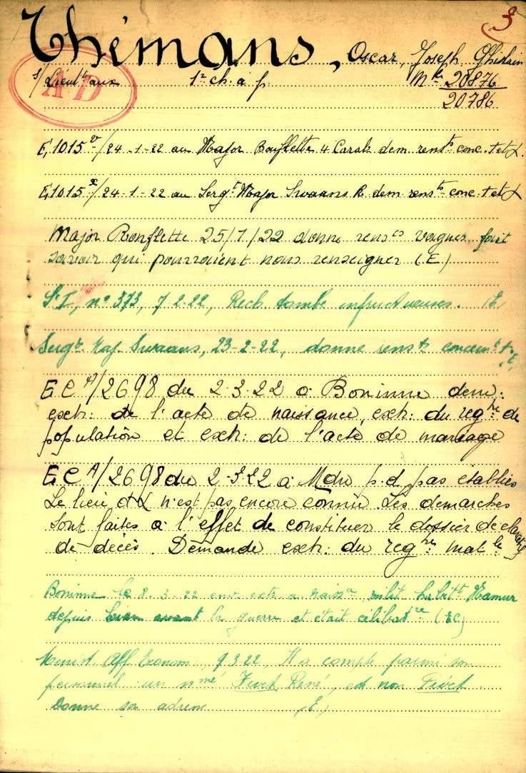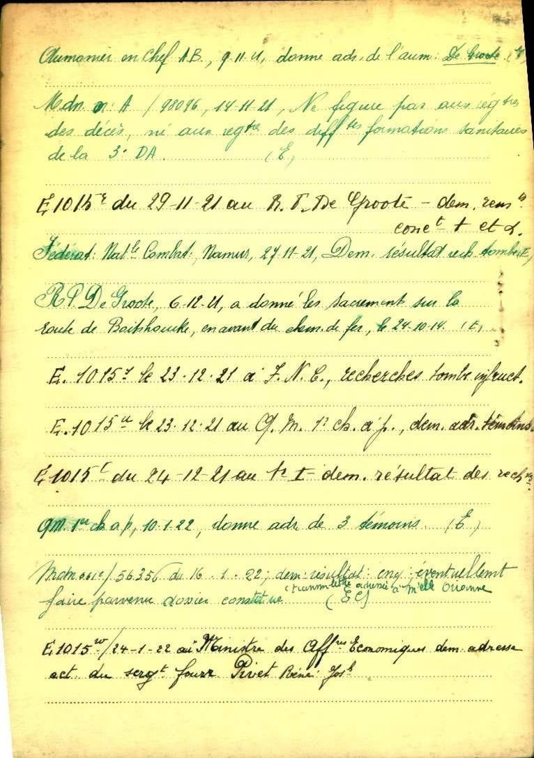 Maj Ronflette van de 1ste Carabiniers laat weten dat hij geen informatie heeft maar geeft in zijn brief van 31 augustus 1921 de naam van een aalmoezenier die misschien meer zou kunnen weten.