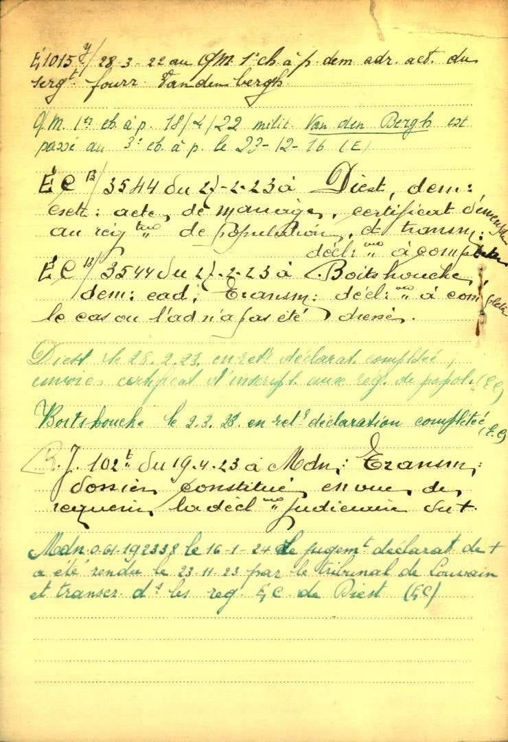 Ministerie van defensie 16 januari 1924: het gerecht heeft de overlijdensakte opgesteld op 23 november 1923 uitgesproken door de rechtbank van Leuven en bezorgd aan de burgerlijke stand van Diest.