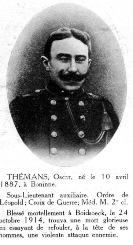 Op een heldhaftige wijze komt onderluitenant Themans om het leven op 24 oktober 1914 in de omgeving van Booitshoeke aan de spoorweg.