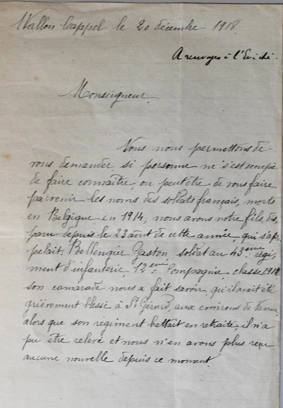In overeenstemming met uw wensen en het verzoek dat ik had ontvangen van de heer Bellengier-Castier uit Waalskappel (Frankrijk), zocht ik overal waar ik iets kon terugvinden van Gaston Bellengier, gewond in augustus 1914 en ik vond niets.