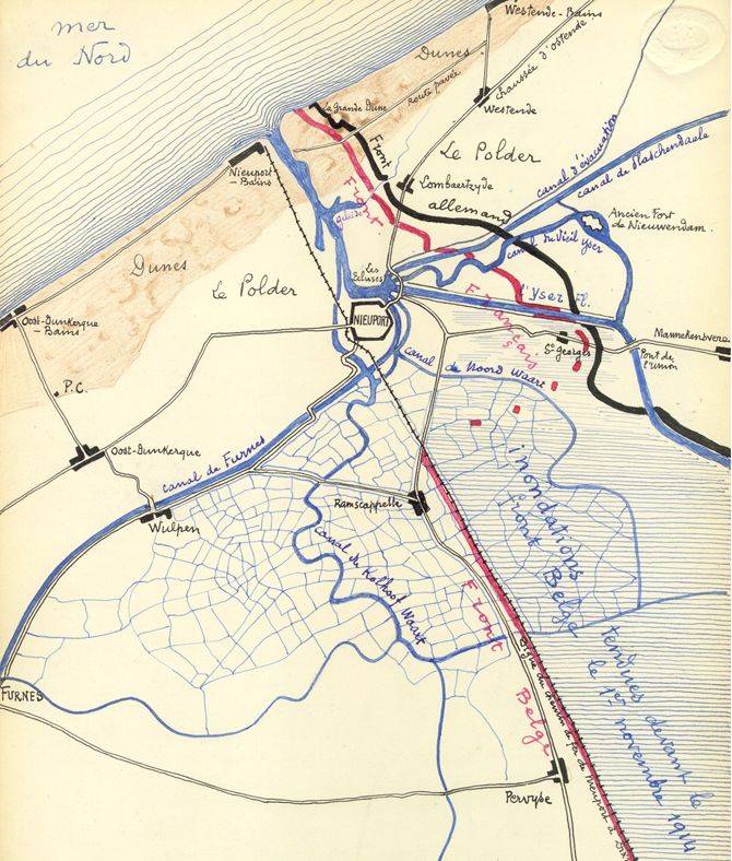 Kaart van het front bij Nieuwpoort, gemaakt door generaal Hély d'Oissel, in het zwart de Duitse linies, in het rood de Franse en Belgische.