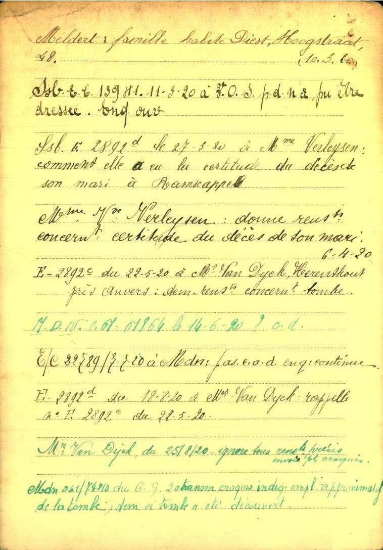 Op 22 mei 1920 worden er meer inlichtingen gevraagd aan mhr Van Dyck, van Herenthout, over de plaats van het graf. Hij ontkent echter dat hij iets weet.